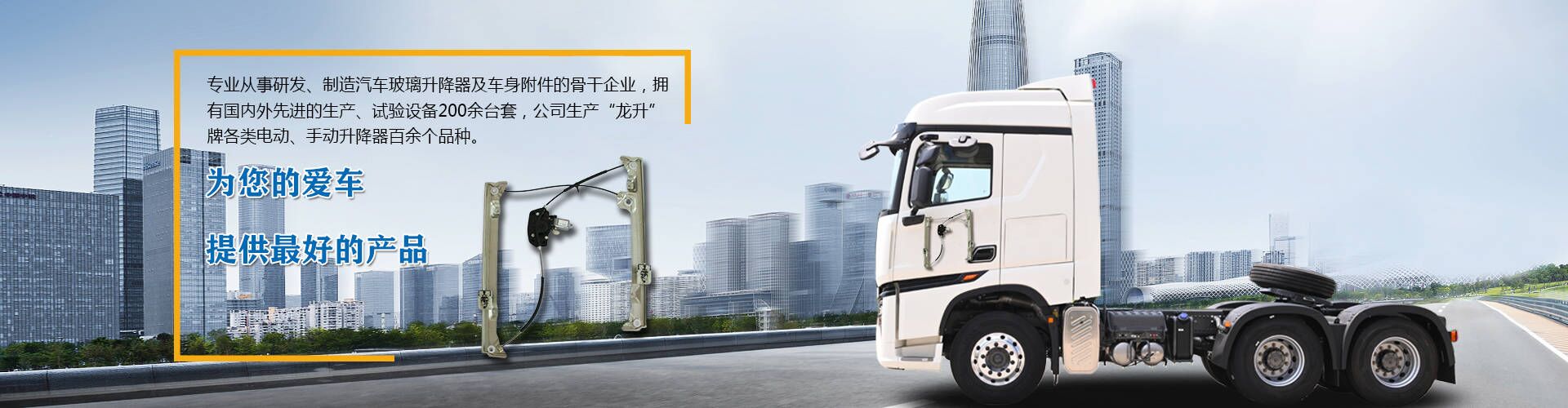 公司占地面積30000多平方米,擁有國內外先進的生產、試驗設備,依據國家汽車行業標準研發、生產龍升牌各類電動、手動升降器百余個品種,主要為:北汽福田、中國一汽、中國重汽、東風柳汽、徐工汽車、浙江零跑、廈門金龍等多家汽車廠配套,產品主要配套車系有乘用車、商用車、新能源汽車。